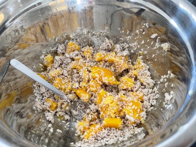 그냥 먹으면 제일 맛있는 망고를 예쁘게 썰더니 코코넛 가루에다 버무림.