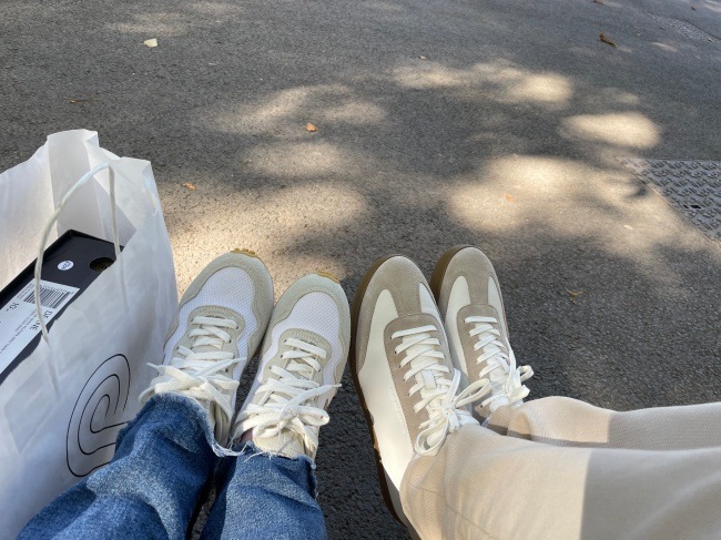 공원에서 샌드위치를 먹다 말고 새 신을 꺼내 신어봤다.