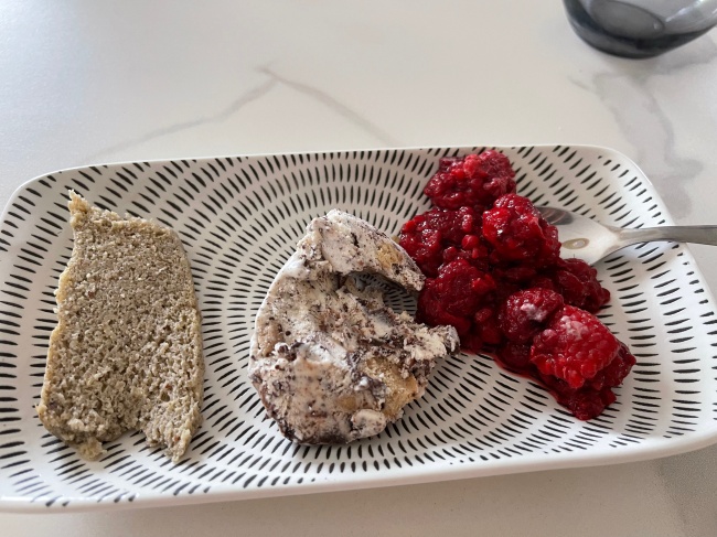후식은 버거씨가 준비했다. 바나나 오트밀 케이크 한조각, 쿠키도우 아이스크림 한 스쿱 그리고 라즈베리-