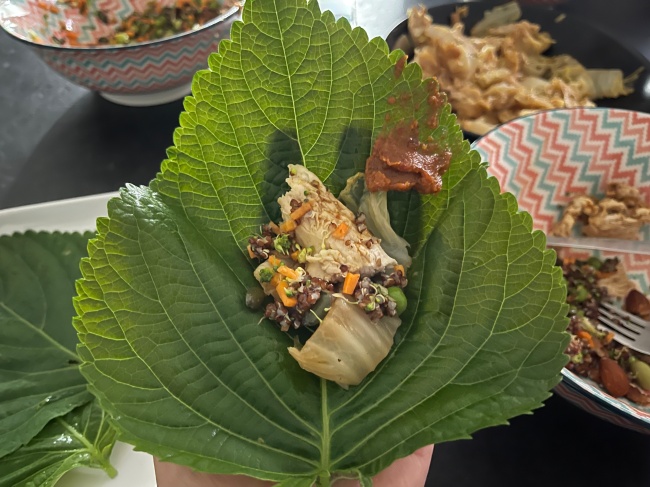 버거씨가 따라해 보더니 너무 맛있다고 눈이 커진다. 깻잎 줄어드는 속도를 본 나는 밖에 나가서 깻잎을 더 따왔다.