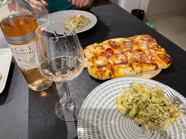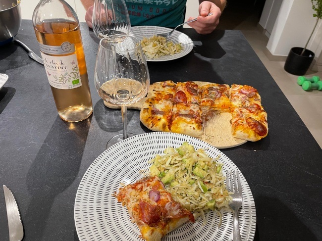 배가 그다지 고프지 않다고 말했더니 버거씨가 피자 하나에 와인을 마시자고 했다.