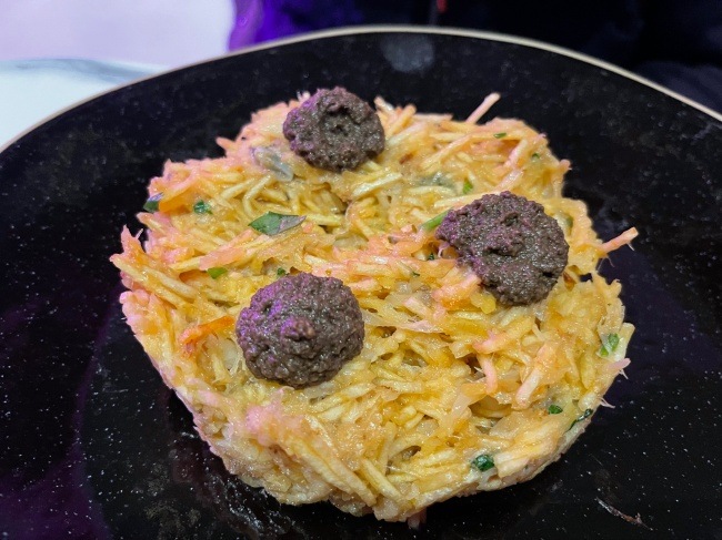 감자튀김처럼 생겼지만 양파, 감자와 함께 흰살 생선을 함께 튀긴 요리였다. 맨 위에는 검은 올리브 소스-