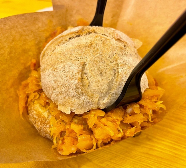 속을 동그랗게 파서 만든 빵그릇에다 뜨끈한 슈크루트를 가득 퍼담는 모습에 홀려서 줄을 섰다. 줄이 꽤 길었는데 기다린 보람이 있었다!