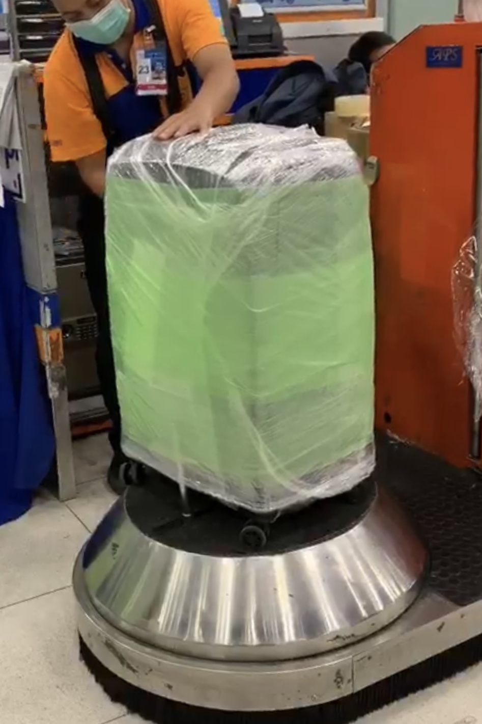 가방을 꽉꽉 눌러 닫은 탓에 불안해 하셔서 수완나폼 공항에서 짐가방 포장도 받으셨는데 신기해 하시며 동영상도 찍으신 시어머니-