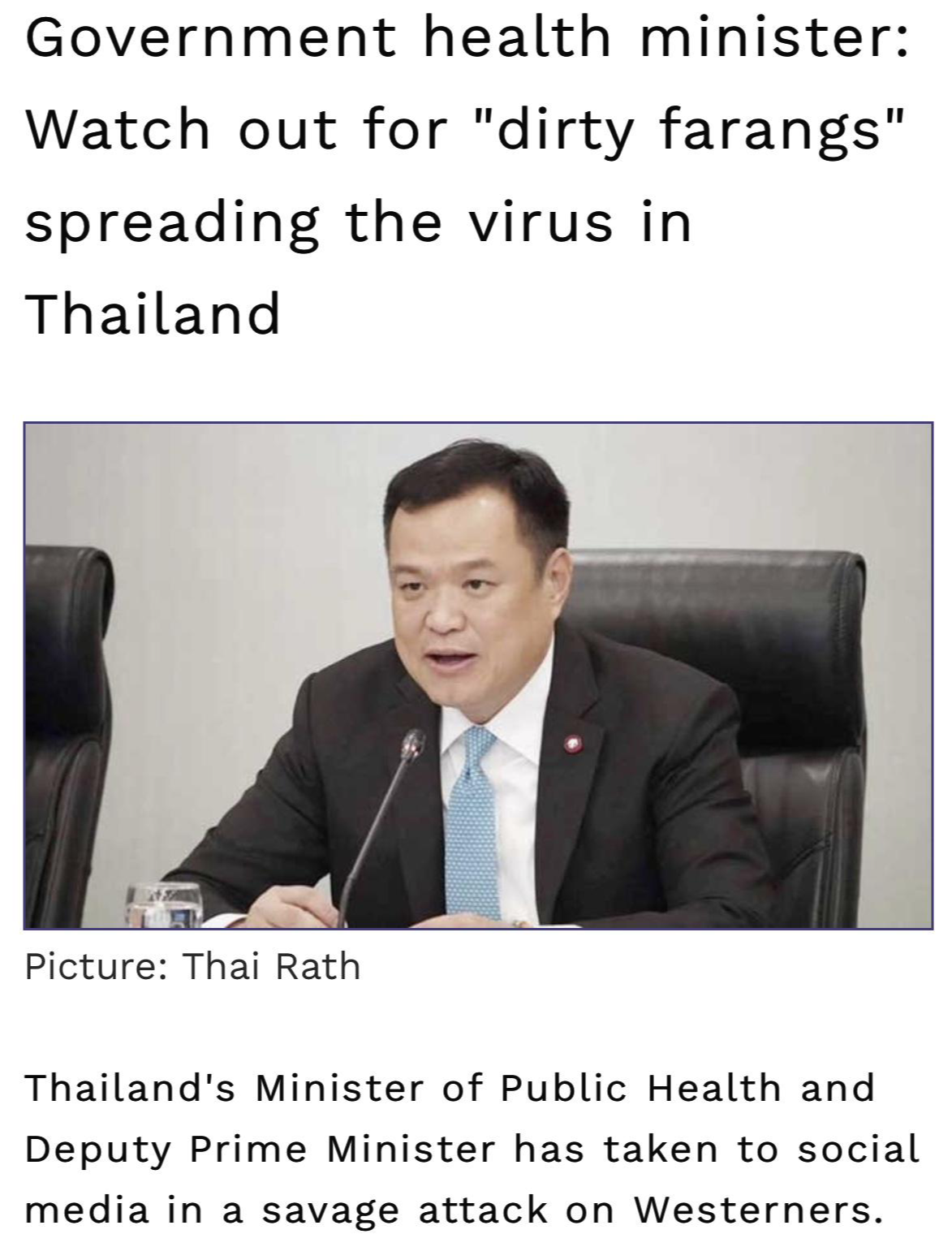 태국의 보건부 장관이 "태국에 바이러스를 퍼트리는 더러운 서양인들을 조심하라"는 트위터를 올린것이다.