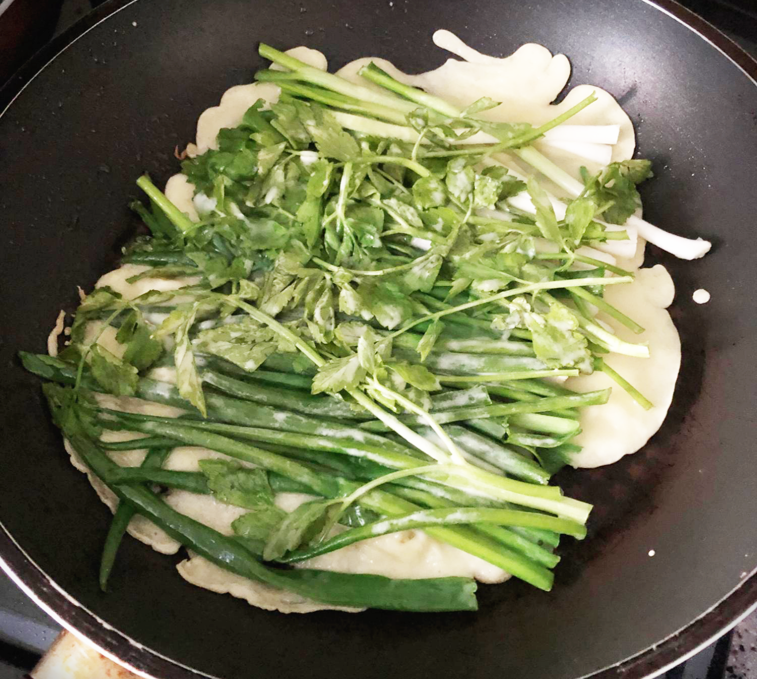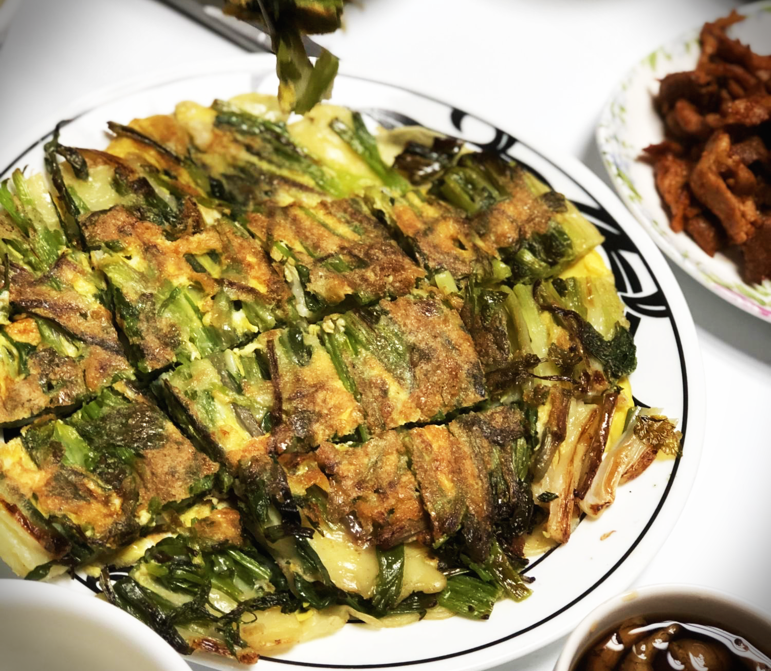 시골에서 이모가 보내주신 쪽파로 파전을 했다. 짜투리미나리도 얹어서-