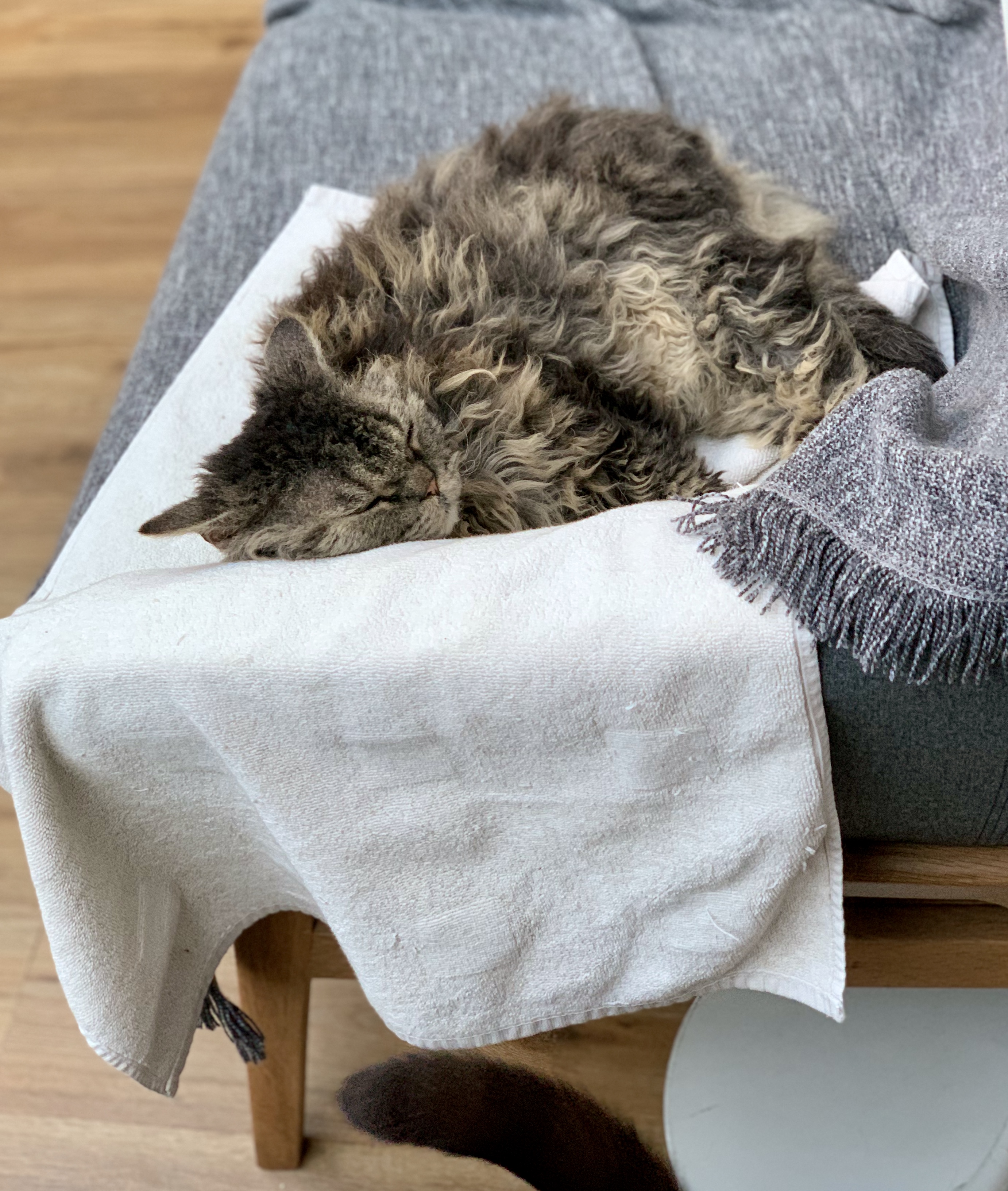 소파 팔걸이에 시어머니께서 수건을 올려두셨는데 수건이 좋았나보다.