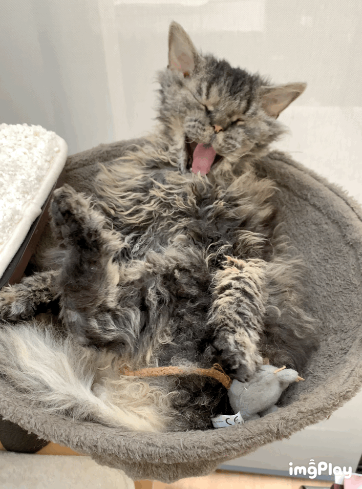 캣타워에서 나른하게 졸고 있는 모웬에게 생쥐인형으로 놀아주려고 했다.
