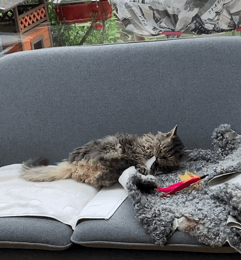방금전까지 꼭 자기같이 생긴 카펫위에서 졸고 있더니 어느새 카펫이랑 씨름을 시작했다.