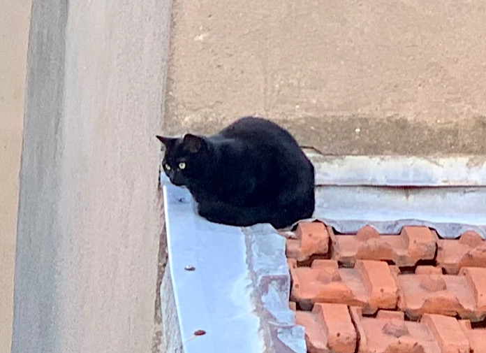 옆집 고약한 암고양이 틱스가 지붕 꼭대기에서 뭔가를 응시하고 있었다.