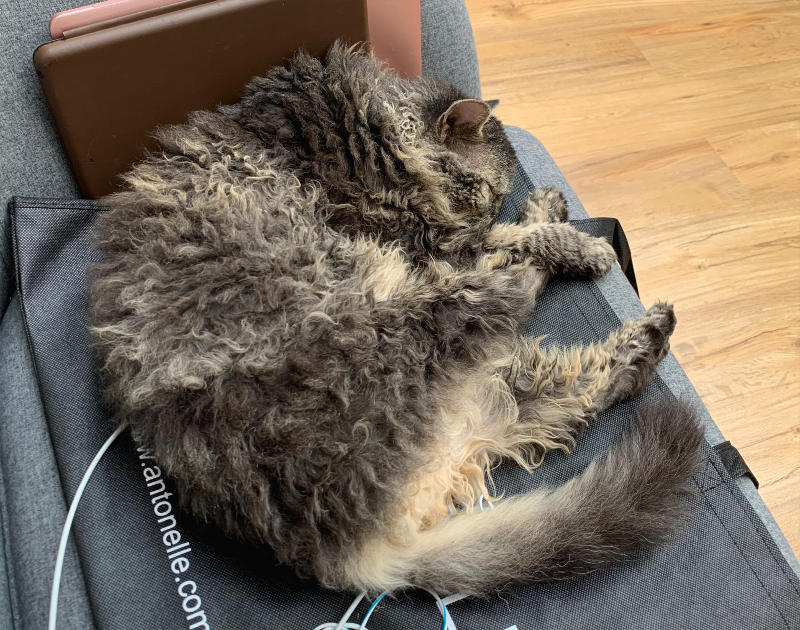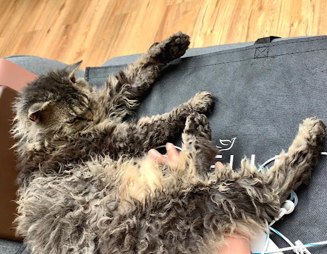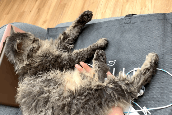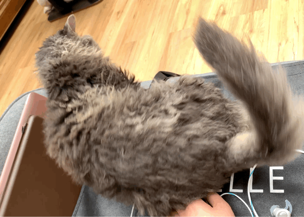 사람 손이 밑에 깔려있는데도 태연하게 그루밍에 열중하는 모웬.