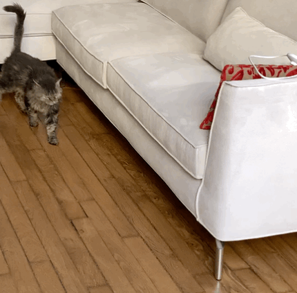 소파를 맨 처음 대면하던 모웬은 이리저리 킁킁거리며 살펴보더니 살며시 앞발을 올려서 긁으려고 했다.