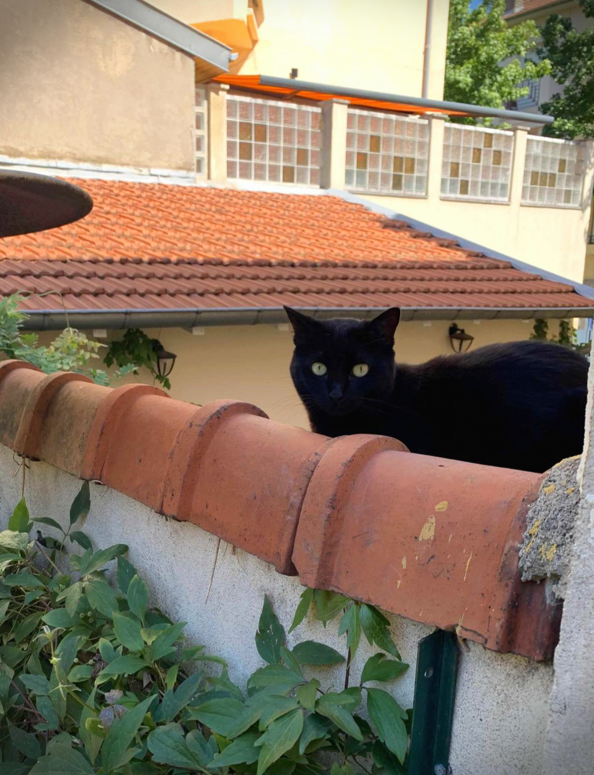"며칠전에 또다른 검은 고양이가 나타나서 틱스가 아주 혼쭐이 났거든. 그때부터는 쟤가 담장을 잘 안넘어오고있어. 겁먹었나봐. 맨날 저기서 저렇게 우리집을 감시만 하고 있지. 그리고나서 저녁에는 지들엄마한테 가서 이집에서 뭘 봤는지 다 말하겠지...? 난 쟤가 여전히 밉지만 요즘은 좀 괜찮아. 우리 아이들을 괴롭히지 않아서..."