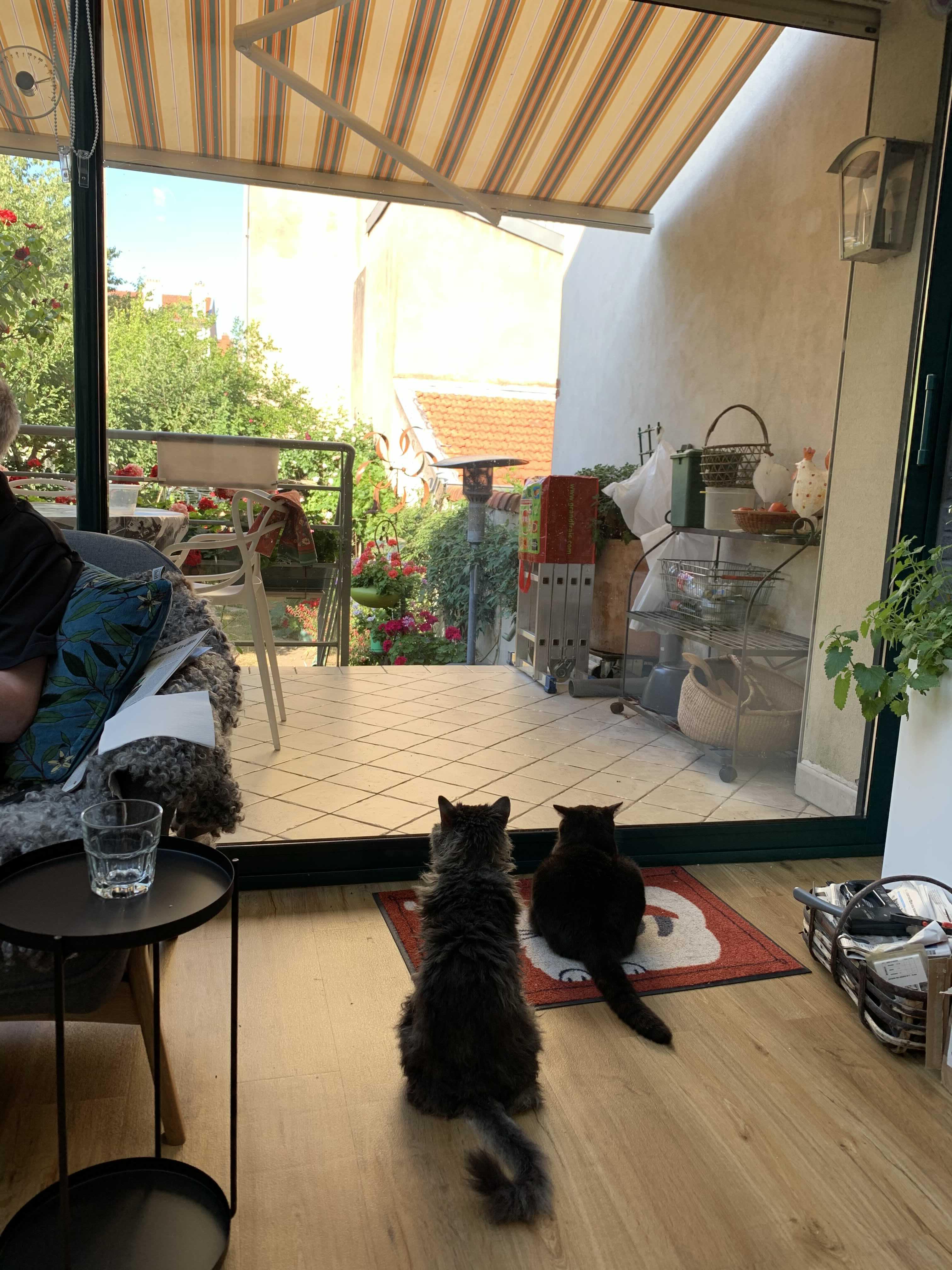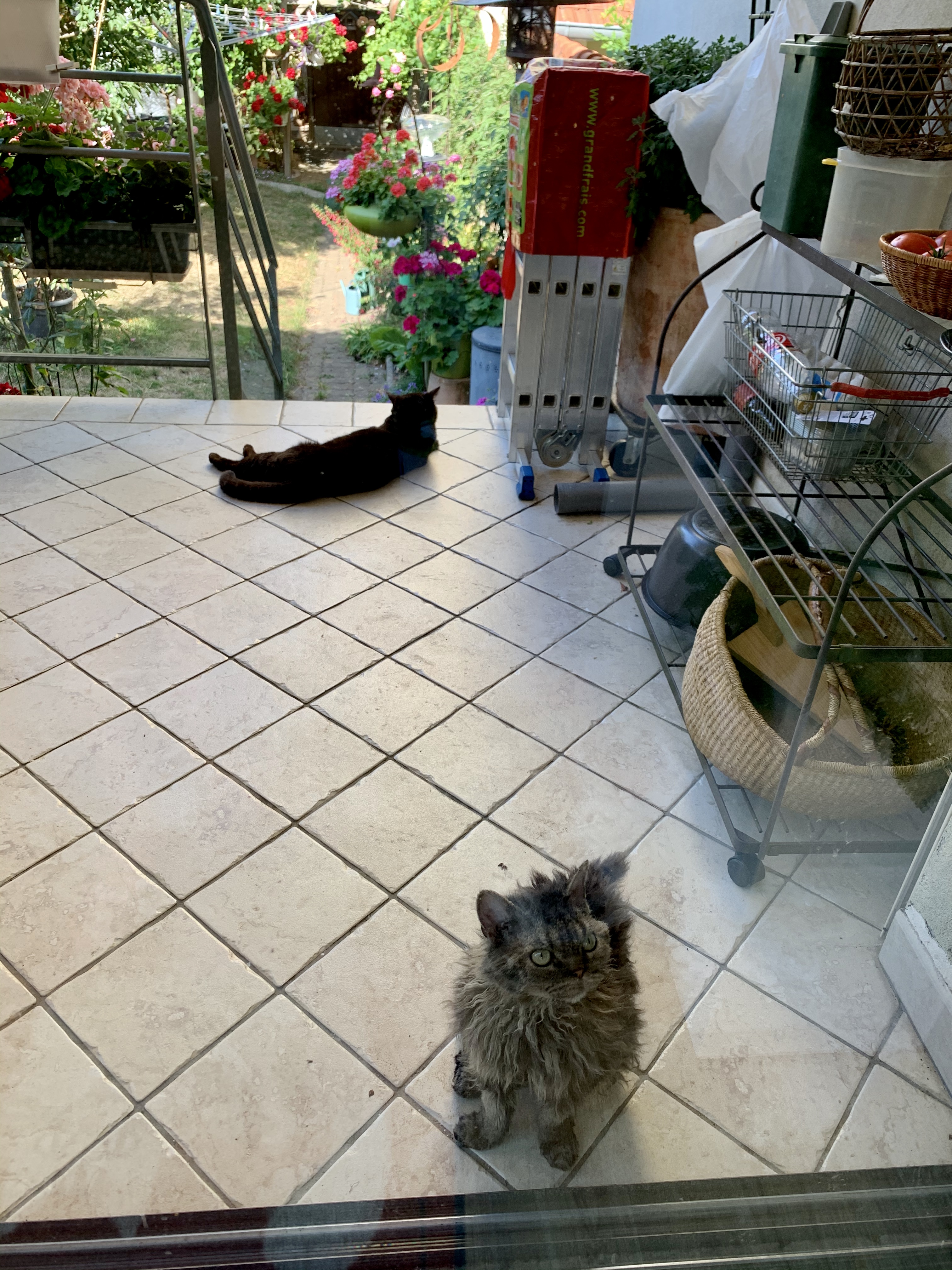 시어머니말씀이, 얘네가 에어컨때문에 안들어오는거라고 하셨다. 시원한것도 그다지 좋아하지 않는데다 너무 낯선 느낌이라 그런지 에어컨만 켜면 둘다 밖으로 나가버린다고...
