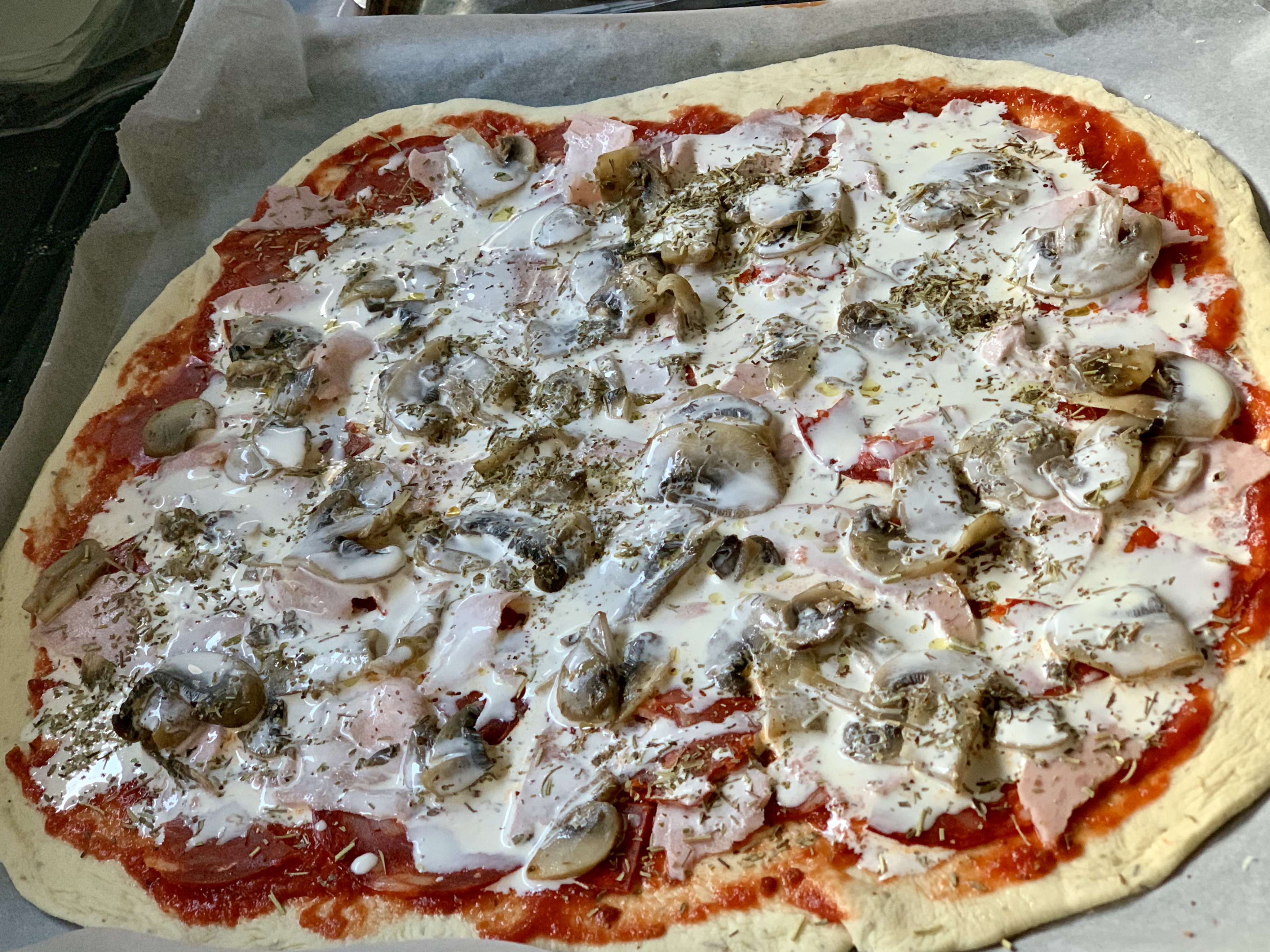 토핑을 다 올린 후에는 피자 치즈를 듬뿍 올려주면 좋겠지만... 치즈 안먹는 희한한 프랑스인 자서방은 치즈 대신에 생크림을 듬뿍 올린다. 근데 이게 또 맛있다. 토마토 소스와 묘하게 맞아떨어진다.