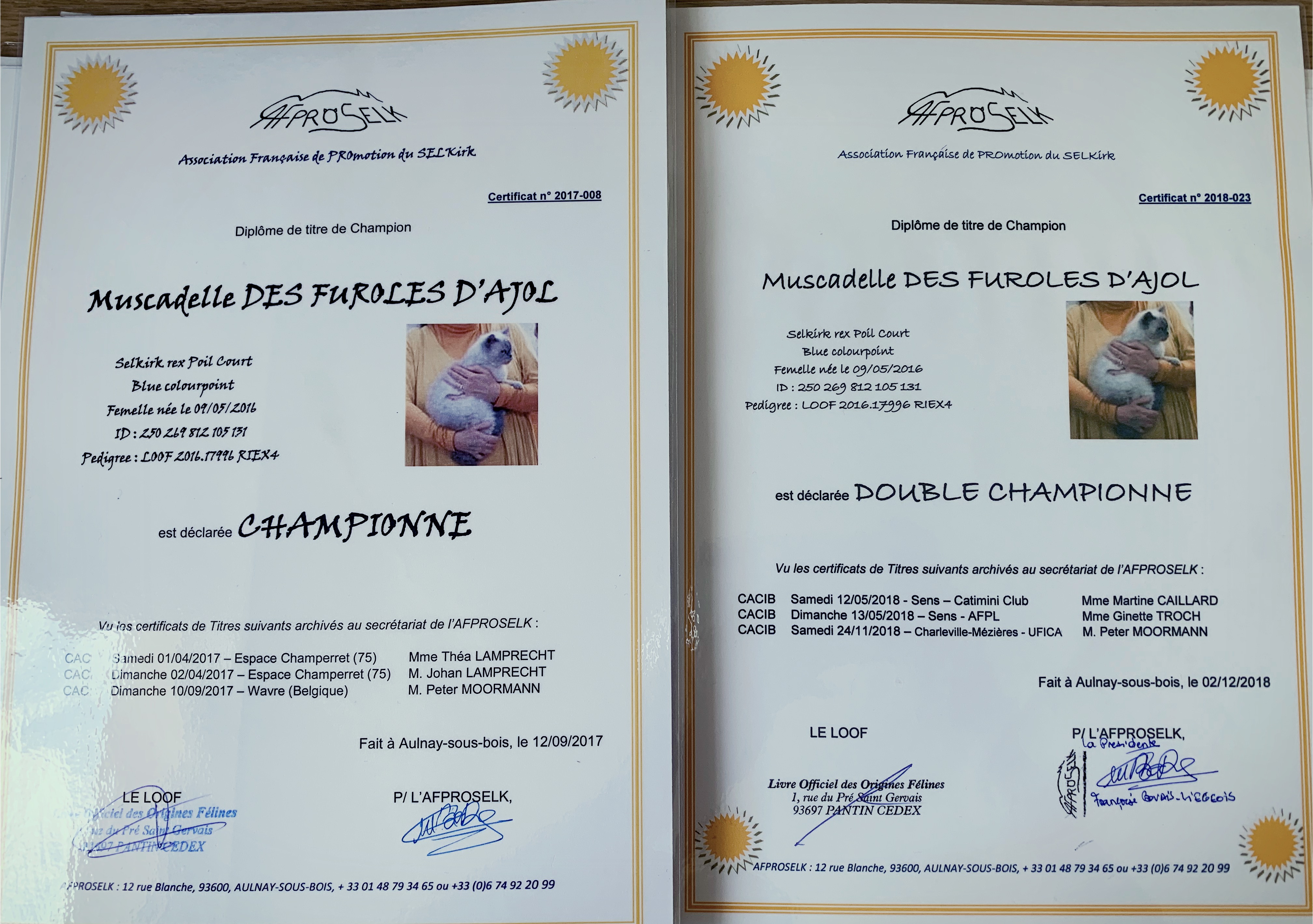 브리더께서는 무스카델의 수상 증서는 2007년, 2008년꺼만 주셨다. 2년 연속으로 셀커크 챔피언과 더블챔피언을 받았다.