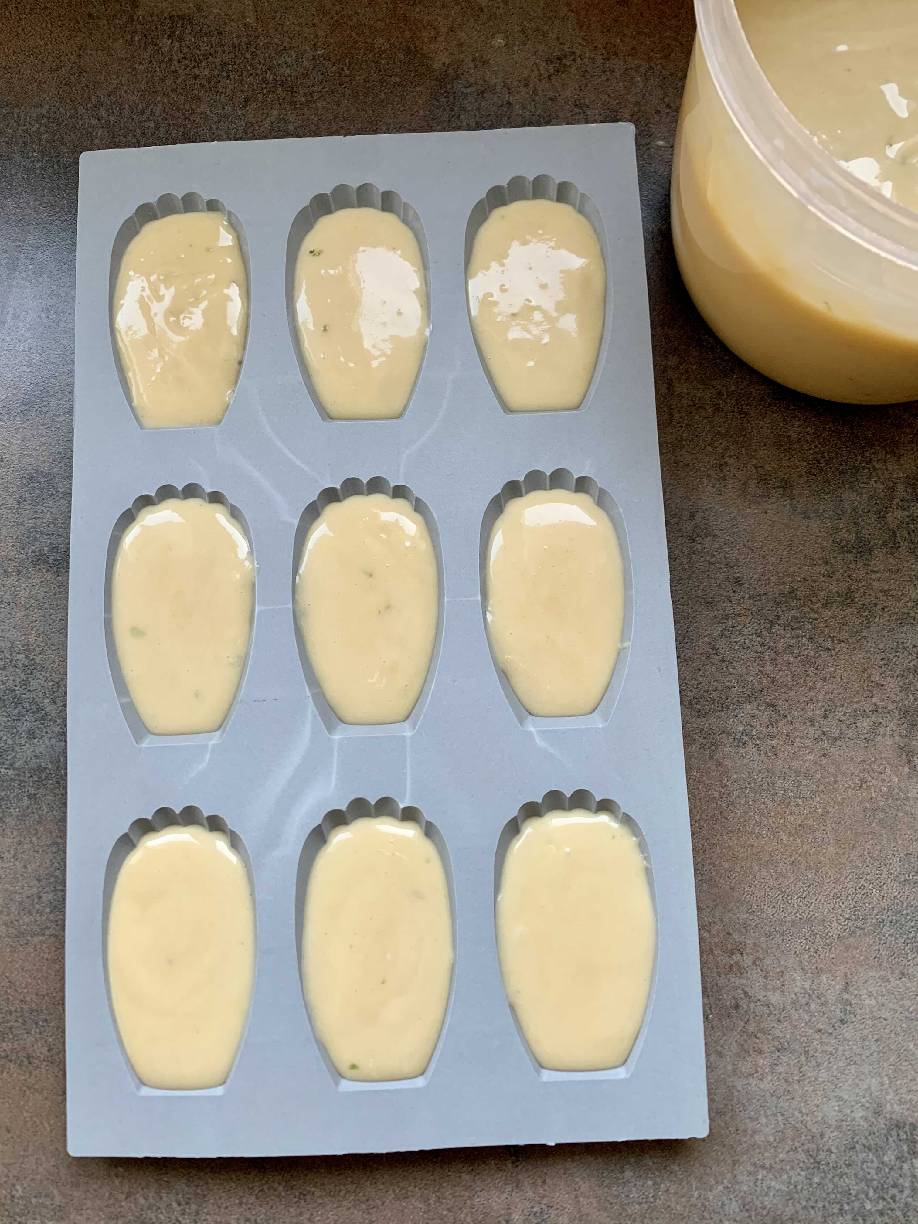 5. 마들렌 틀에 반죽을 담을때 짤주머니를 이용해도 되지만, 숟가락 두개를 이용해서 퍼도 됨. (숟가락 하나로 푸고 또 다른 하나로 긁어 내리면서)