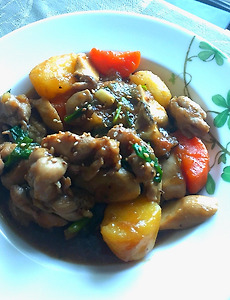 요리는 항상 자서방 담당이고 내가 요리를 하는 경우는 오직 나 혼자만을 위한.. 주로 자서방 안먹는 매운 요리ㅎ 암튼 오늘은 갑자기 오만년만에 자서방을 위한 요리가 하고싶어졌다. 며칠전 기내에서 먹었던 닭고기가 너무 맛있어서 흉내내 보기- 재료: 뼈없는 닭고기, 양파, 감자, 당근, 파, 버섯 양념: 간장 또르르르, 설탕 한숟가락, 물엿(없어서 생략), 참기름, 소주 (집에 뒹굴던게 있어서..), 마늘, 생강 뼈없는 닭고기를 먹기좋게 잘라서 간장 설탕 마늘 생강 그리고 소주 약간과 챔기름 약간넣은 양념에 한 삼십분 재워줬다. 양파를 안먹는 자서방이기에 (왜 안먹냐 물으면 방귀가 나와서 안먹는다나..?) 눈치 못채게 양파는 믹서기에 갈아버림 ㅎ 감자랑 당근은 내가 좋아하니까 좀 큼직하게..